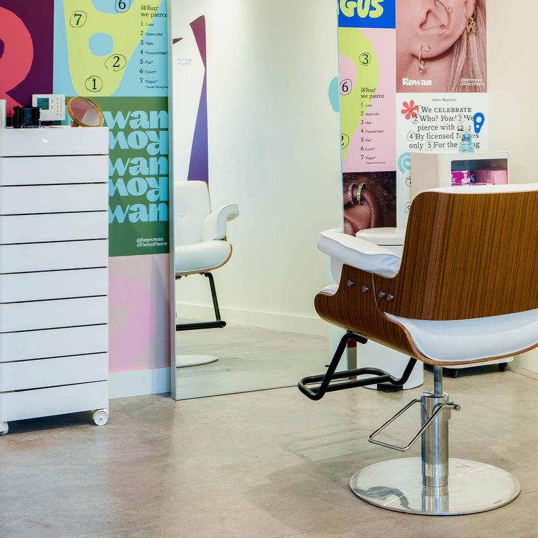 What types of piercings are offered?Rowan is all ears! We only pierce and change jewelry for the outer ear, including lobe, helix, mid helix, forward helix, flat, conch, and tragus piercings. (Placement availability may vary by studio location.)