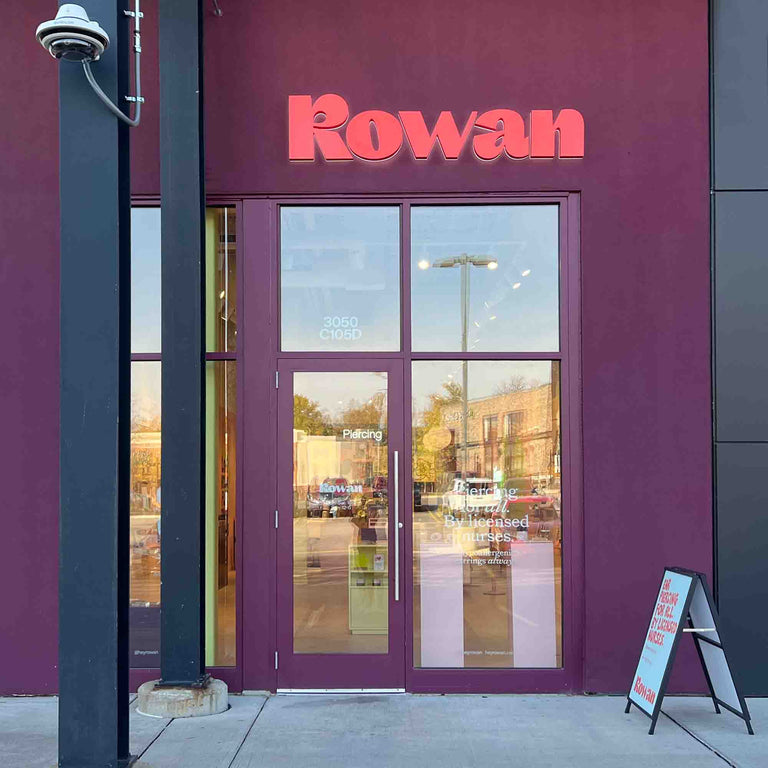 What types of piercings are offered?Rowan is all ears! We only pierce and change jewelry for the outer ear, including lobe, helix, mid helix, forward helix, flat, conch, and tragus piercings. (Placement availability may vary by studio location.)