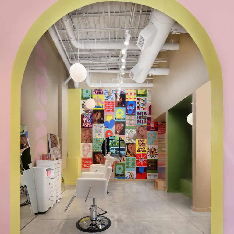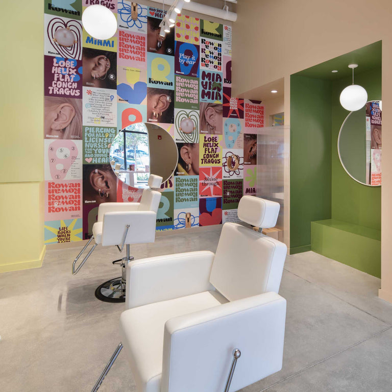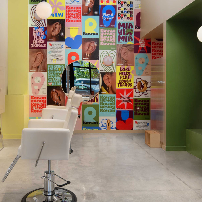 What types of piercings are offered?Rowan is all ears! We only pierce and change jewelry for the outer ear, including lobe, helix, mid helix, forward helix, flat, conch, and tragus piercings. (Placement availability may vary by studio location.)