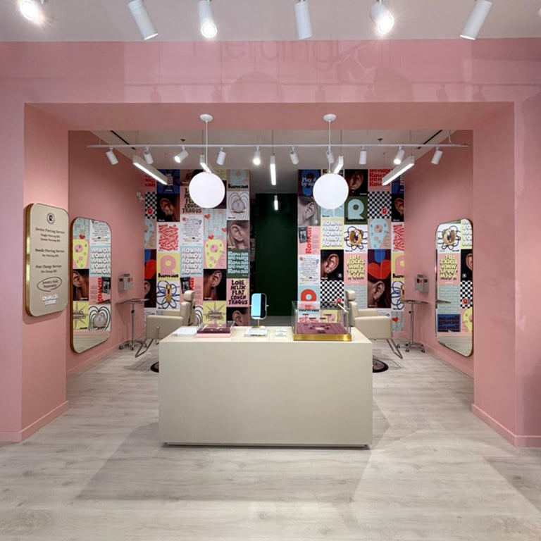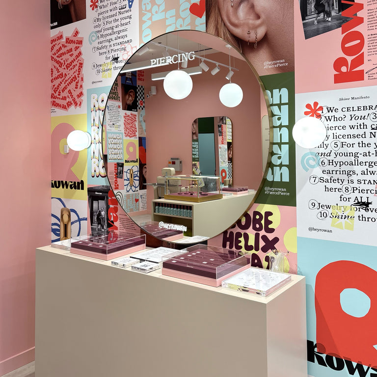 Rowan is all ears! We only pierce and change jewelry for the outer ear, including lobe, helix, mid helix, forward helix, flat, conch, and tragus piercings. (Placement availability may vary by studio location.)