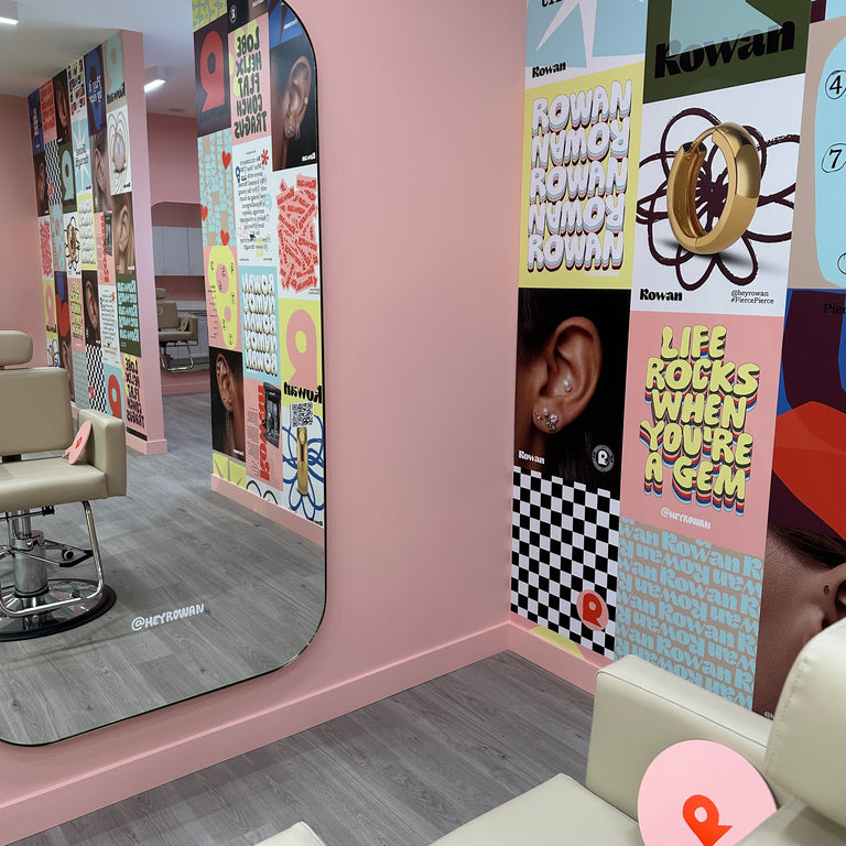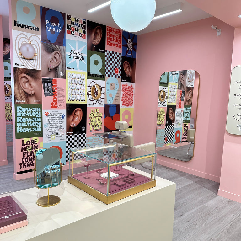 Rowan is all ears! We only pierce and change jewelry for the outer ear, including lobe, helix, mid helix, forward helix, flat, conch, and tragus piercings. (Placement availability may vary by studio location.)