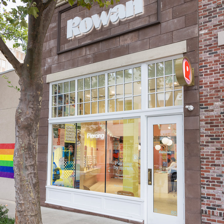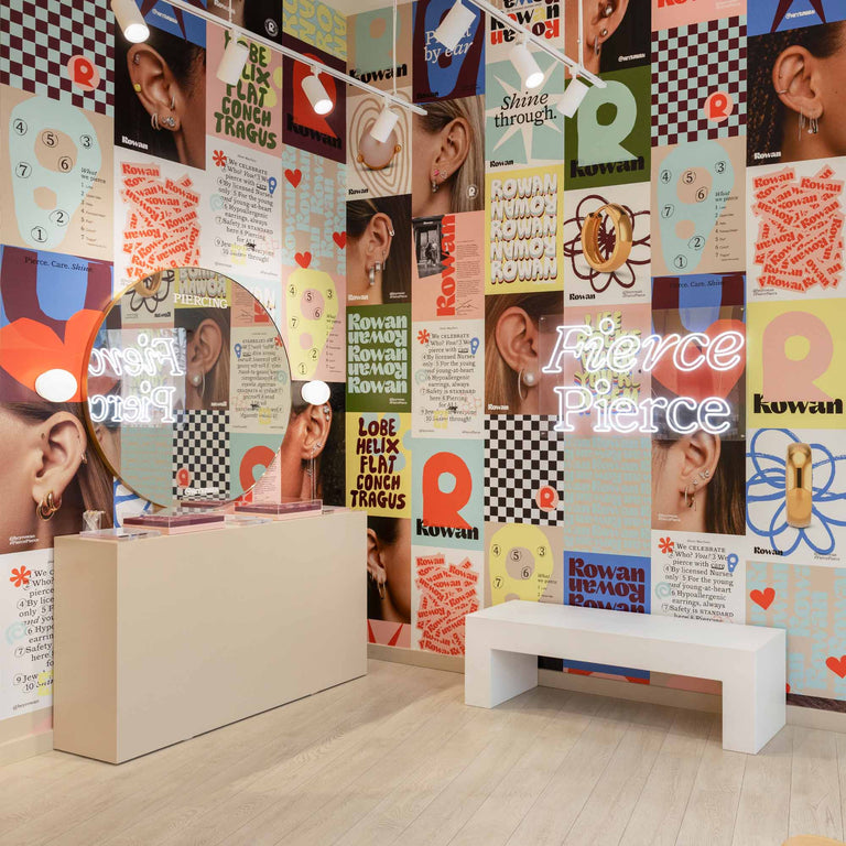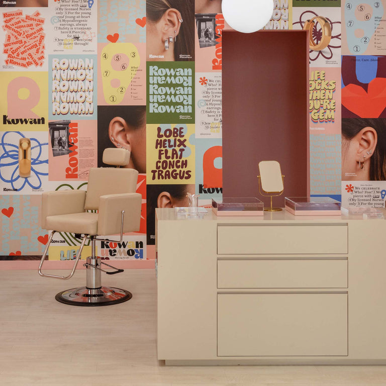Rowan is all ears! We only pierce and change jewelry for the outer ear, including lobe, helix, mid helix, forward helix, flat, conch, and tragus piercings. (Placement availability may vary by studio location.)