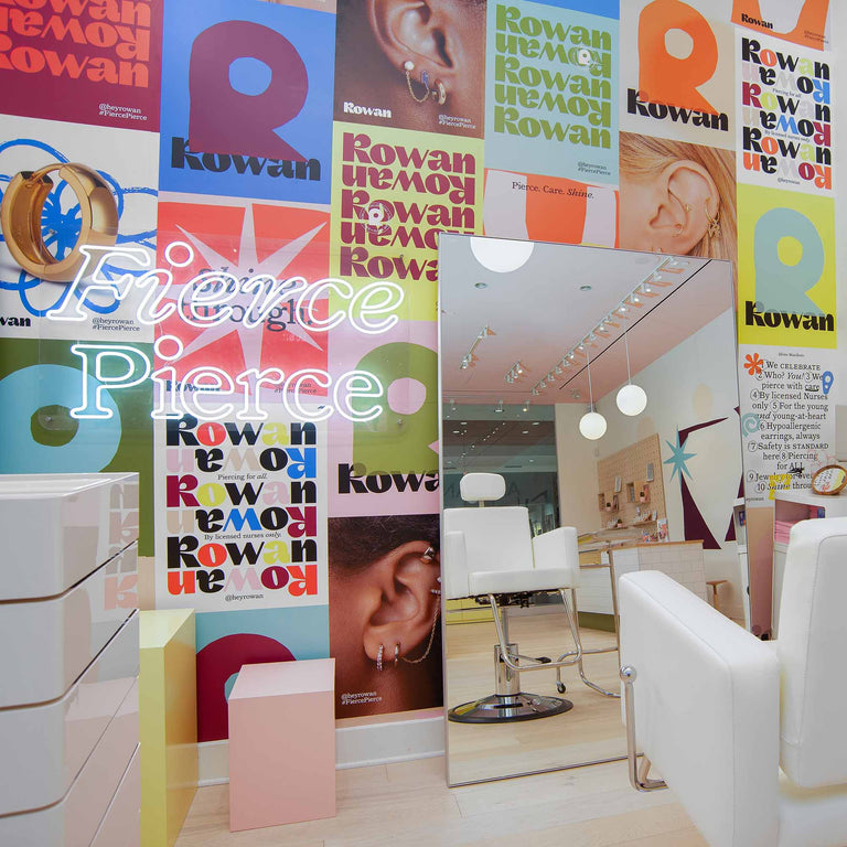 What types of piercings are offered?Rowan is all ears! We only pierce and change jewelry for the outer ear, including lobe, helix, mid helix, forward helix, flat, conch, and tragus piercings. (Placement availability may vary by studio location.)