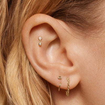 Our flat back earrings feature a titanium post used for piercing. Post-piercing, upgrade to 14k gold posts for $20 per post.