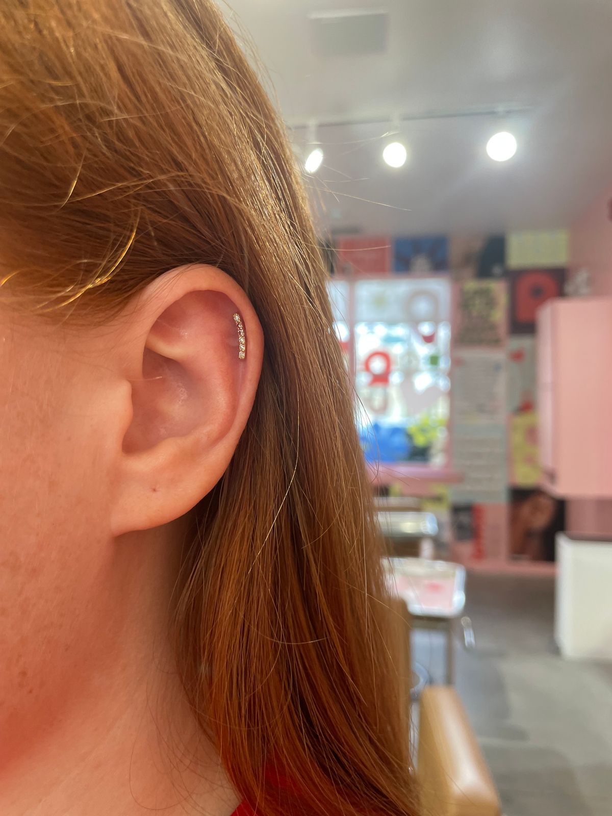 Our flat back earrings feature a titanium post used for piercing. Post-piercing, upgrade to 14k gold posts for $20 per post.