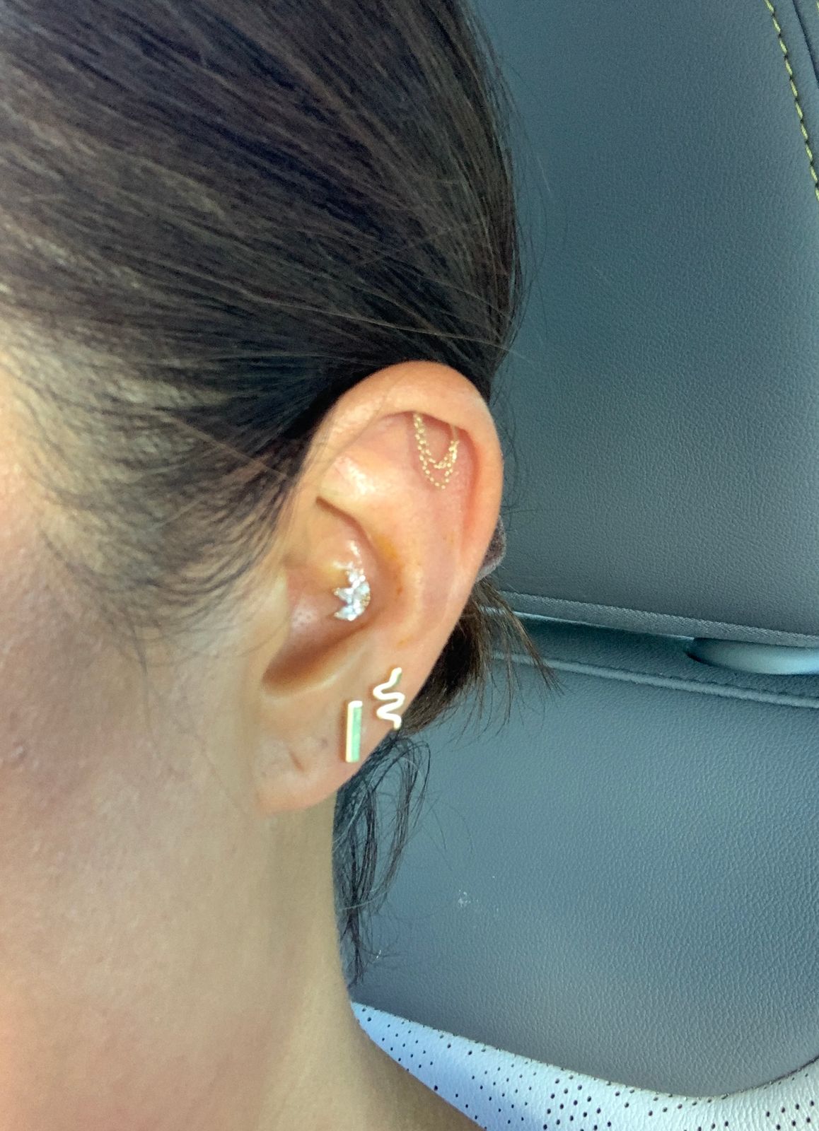 Our flat back earrings feature a titanium post used for piercing. Post-piercing, upgrade to 14k gold posts for $20 per post.